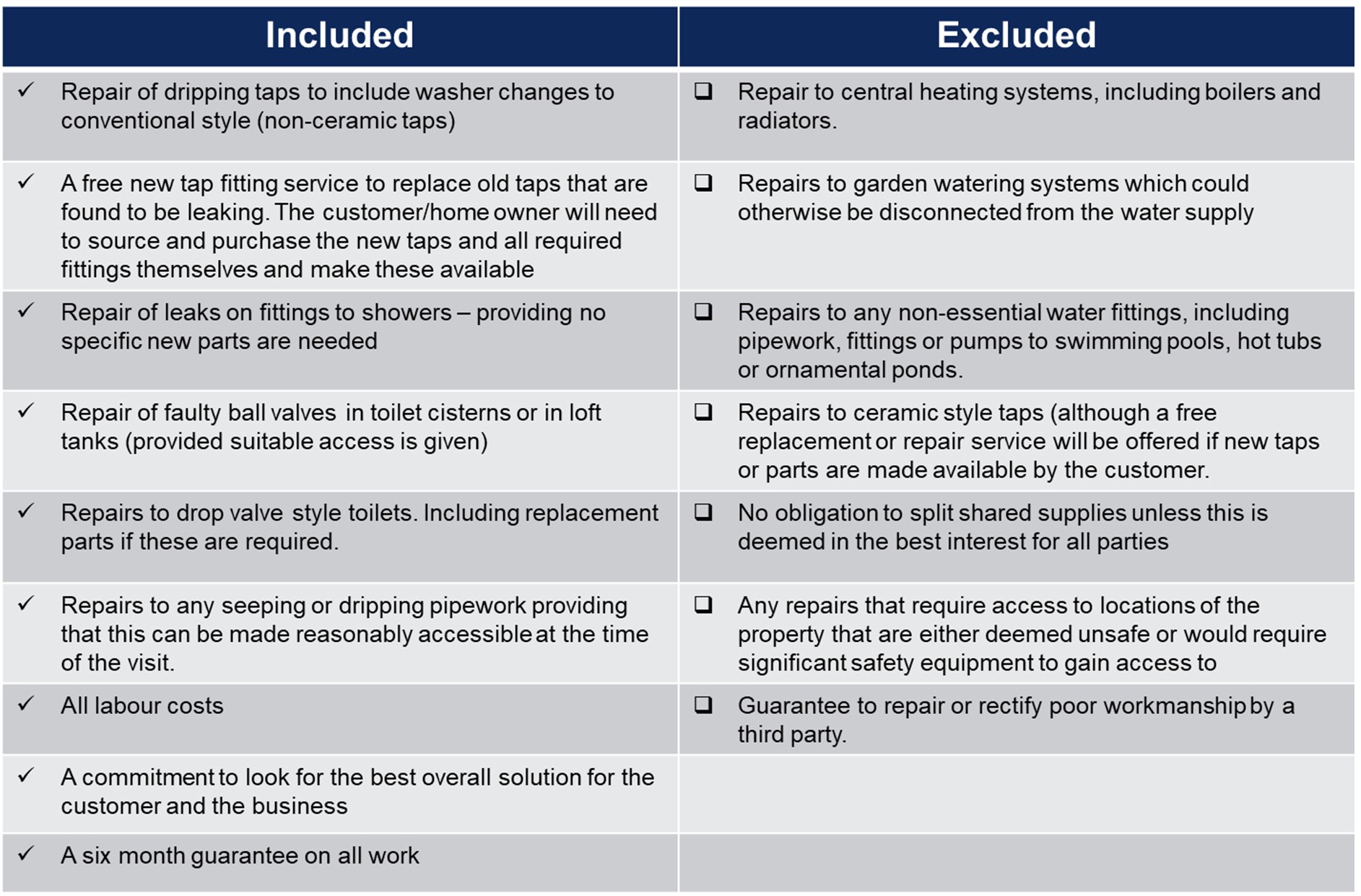 We offer a free of charge repair, subject to T&Cs, whether the leak is internal or external to your property. We will locate and fix the leak and if we are unable to repair the leak we will offer you free and independent advice on what to do next. You can read more detail about the scheme via the factsheet below.
